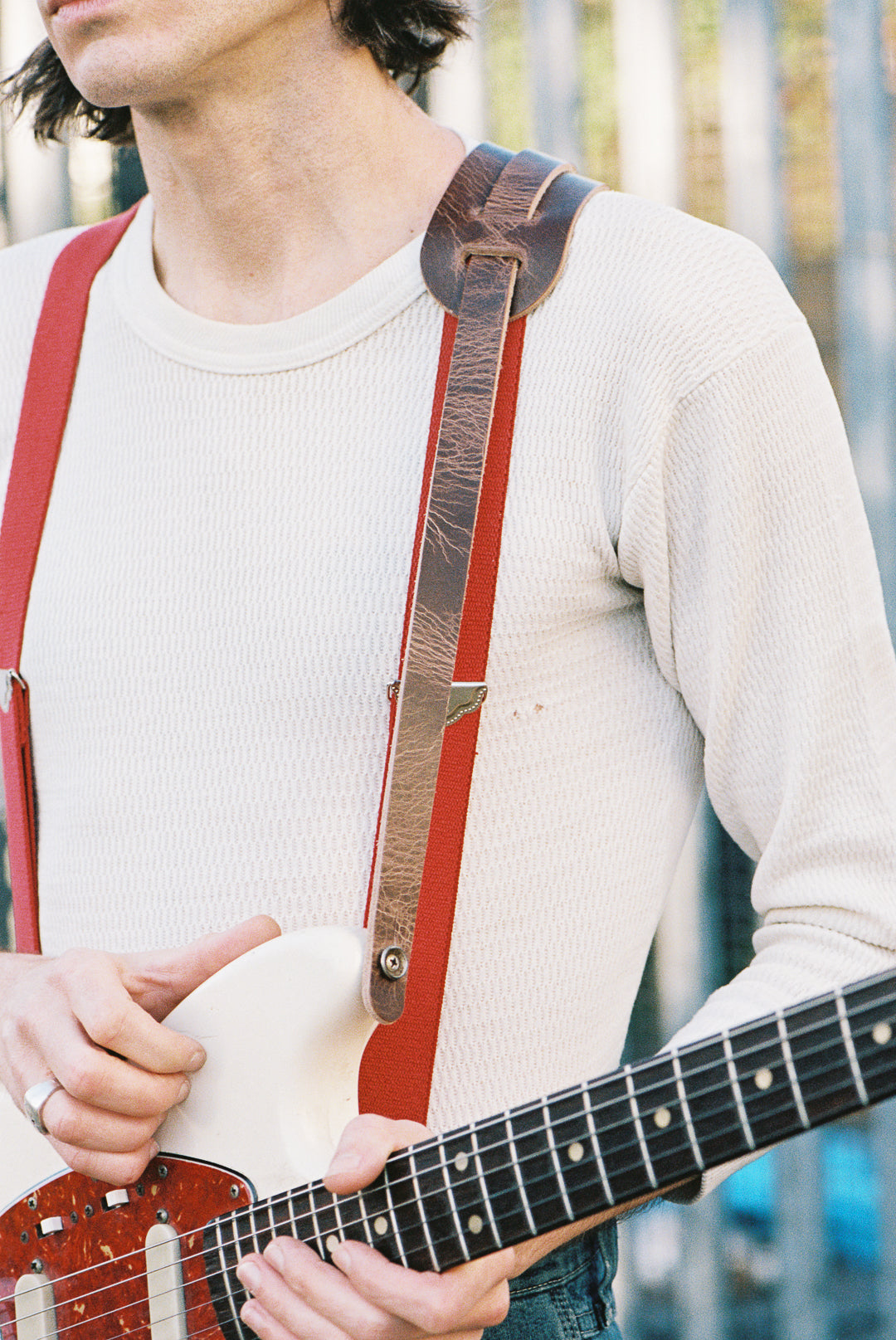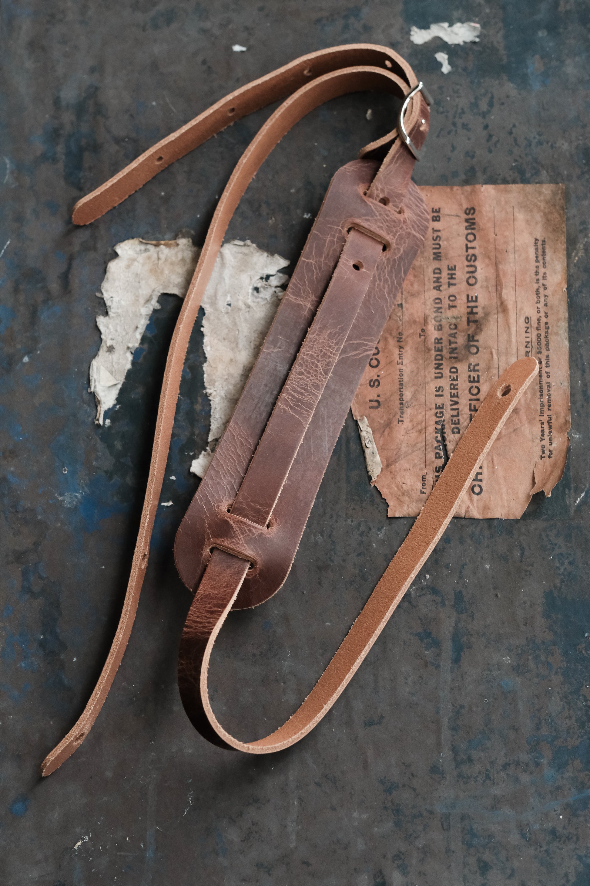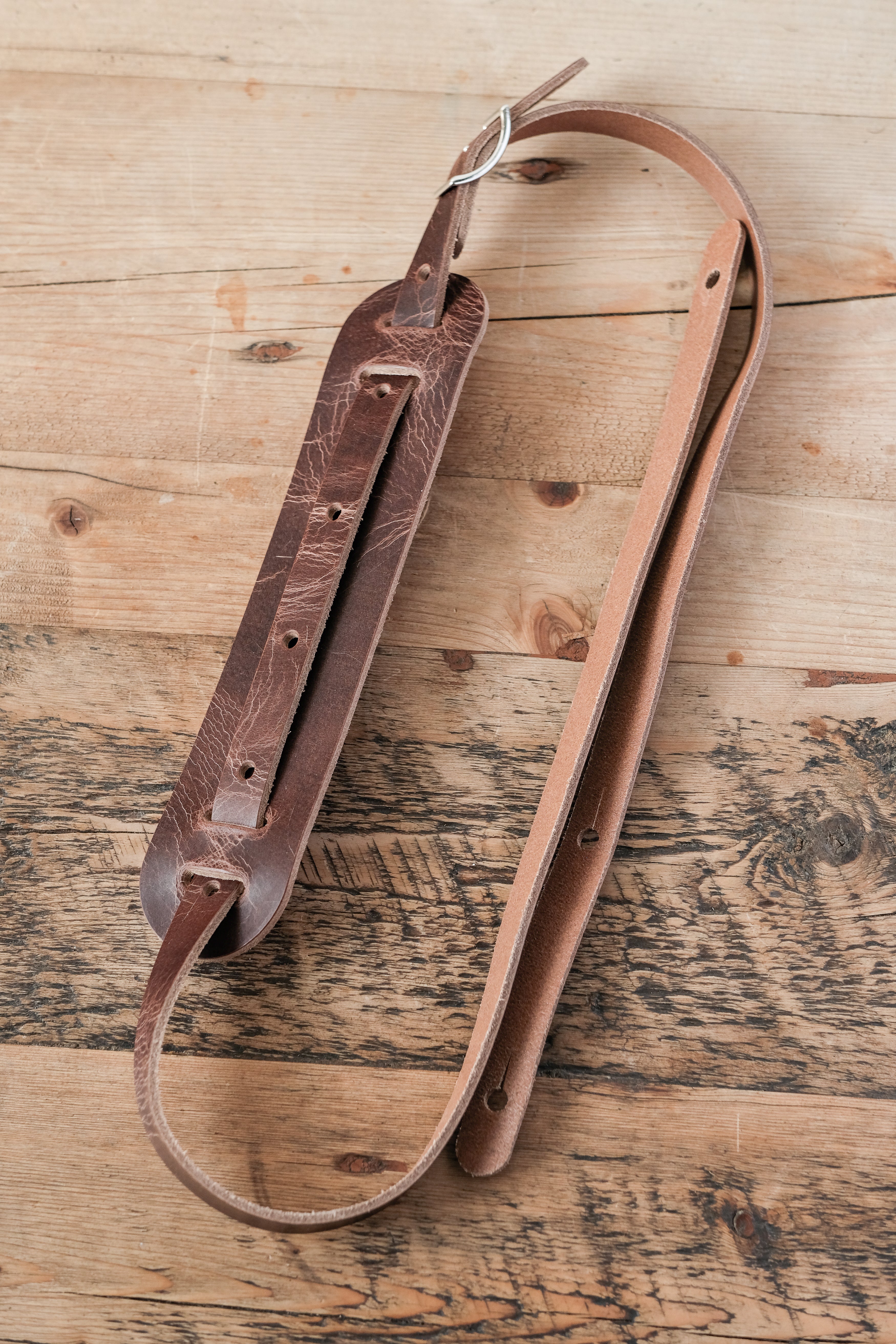 Our take on the iconic leather shoulder pad guitar straps of the 50s and 60s. On supple, heavyweight, full-grain vegetable tanned leather in roadworn brown.