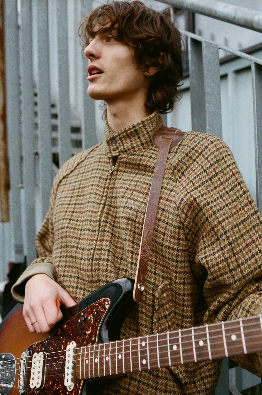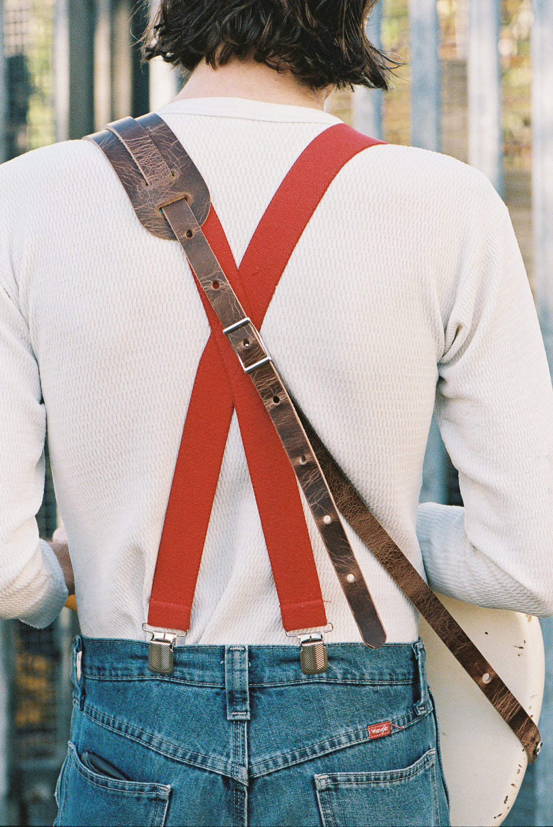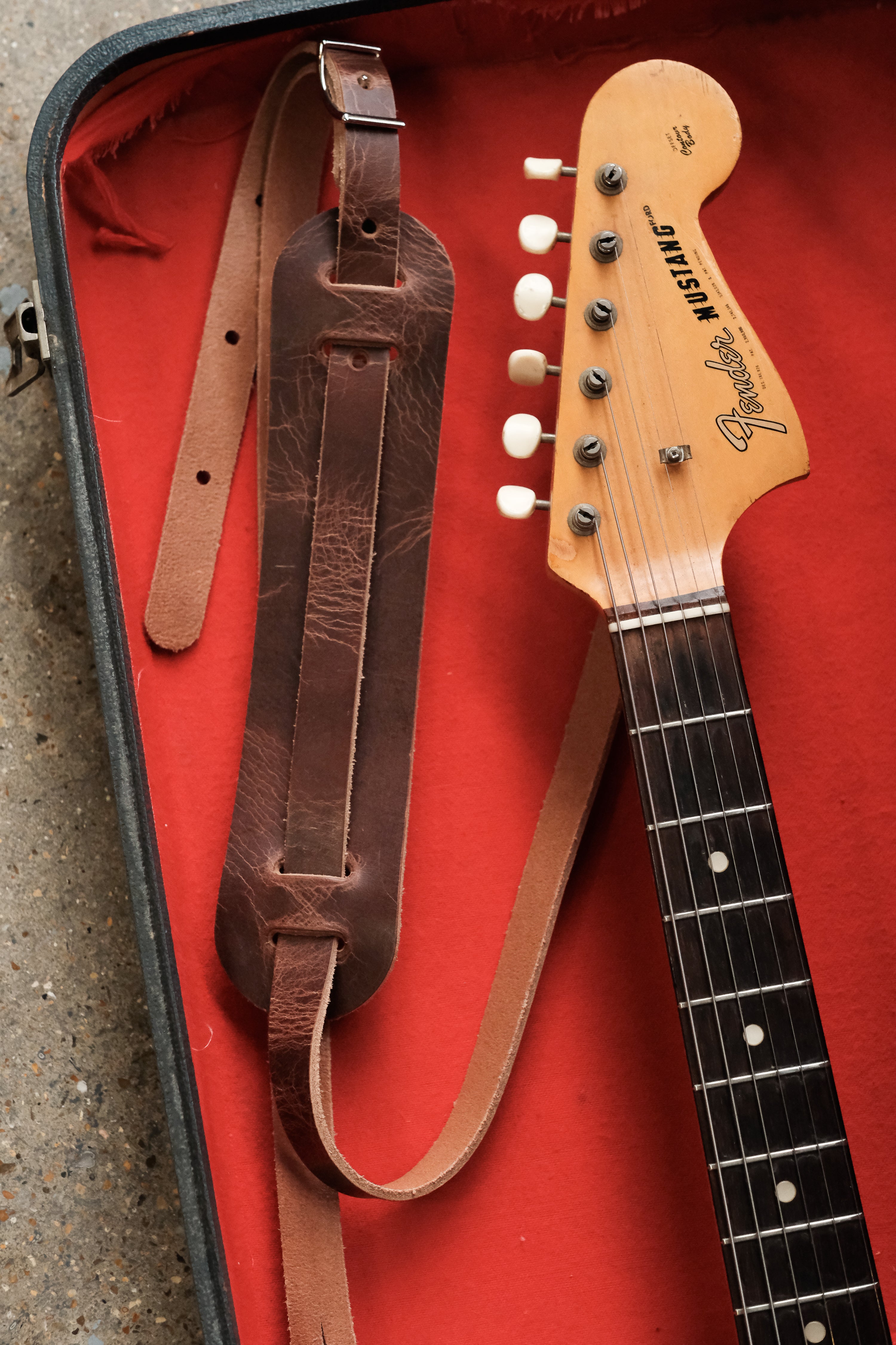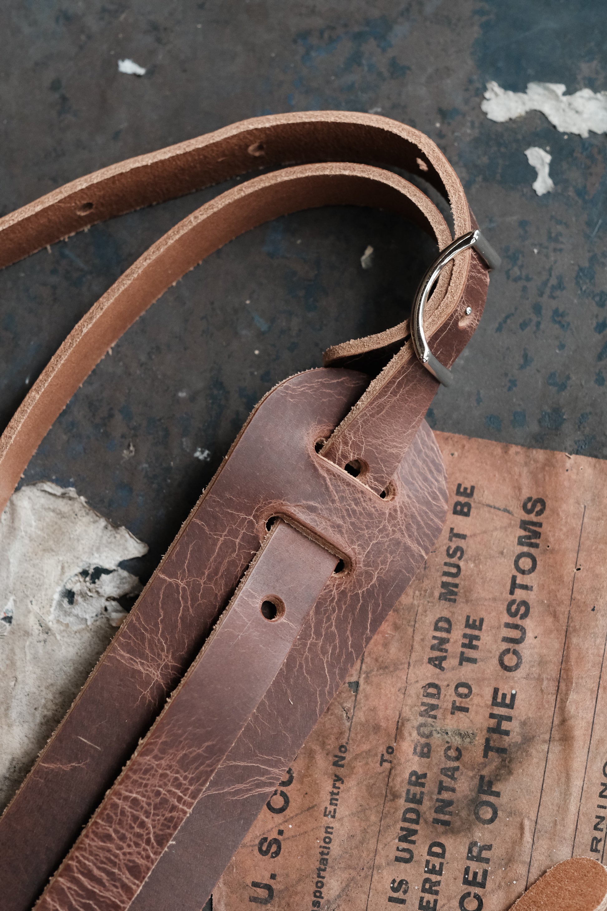 Our take on the iconic leather shoulder pad guitar straps of the 50s and 60s. On supple, heavyweight, full-grain vegetable tanned leather in roadworn brown.