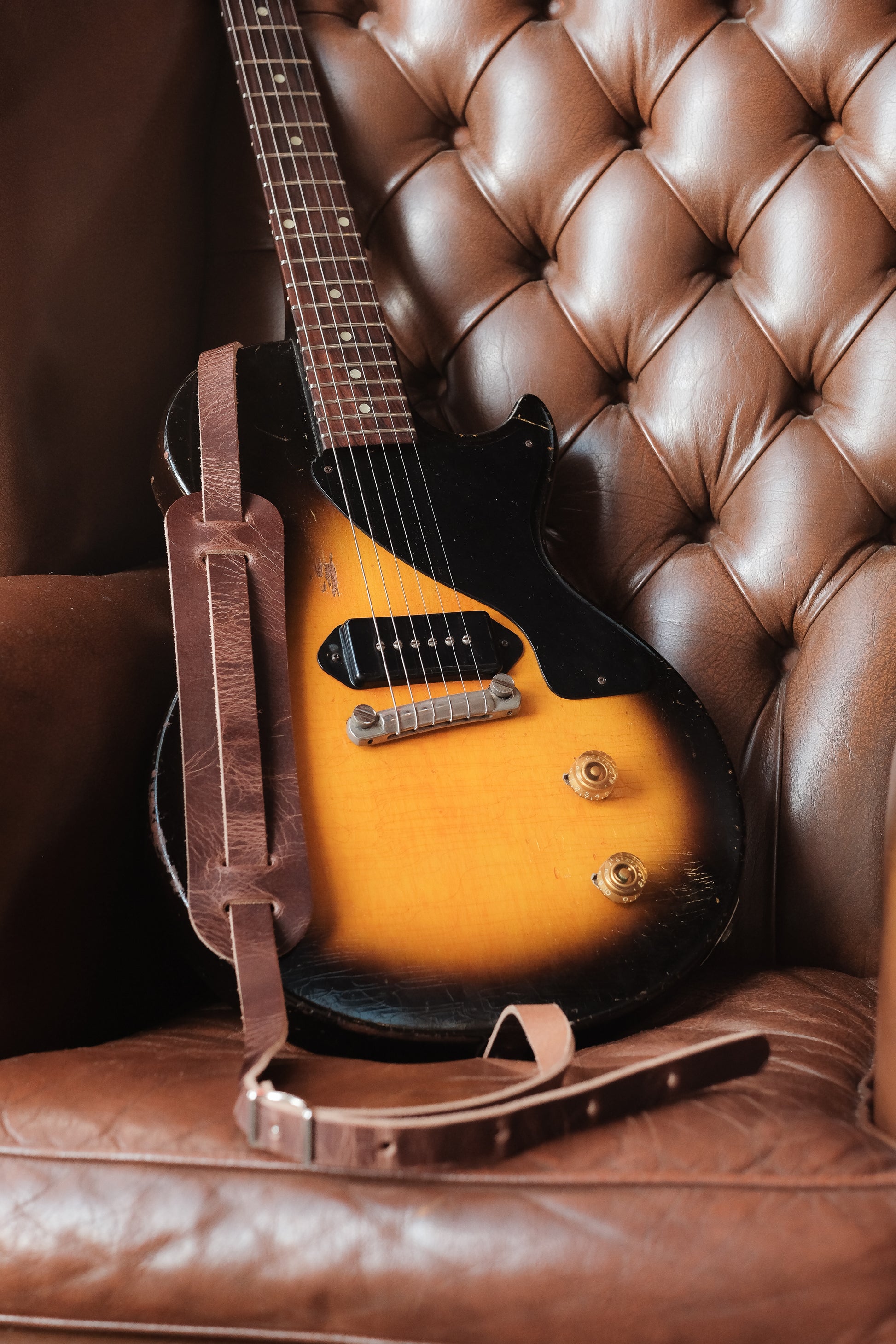Vintage Thin Leather Shoulder Pad Guitar Strap Roadworn Brown - Handmade in the UK